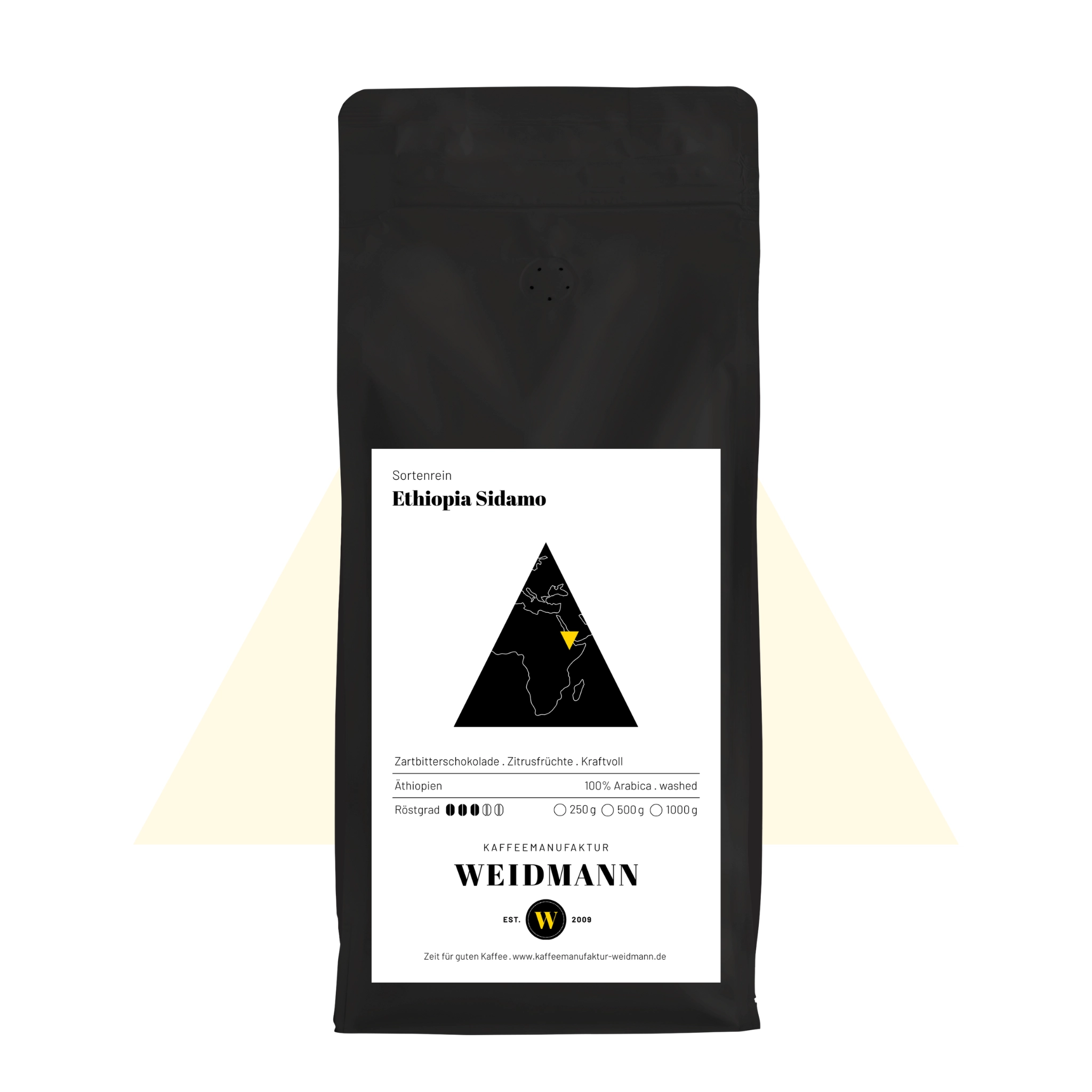 In Äthiopien wurde der Deutschen liebstes Getränk, der Kaffee, entdeckt und kultiviert. Unser Sidamo stammt aus der gleichnamigen Anbauregion, die für höchste Kaffeequalität steht. Unsere schonende Röstung dieses Arabicas bringt die schokoladige Seite und leichte Zitrusnoten zum Vorschein. Kräftig und vollmundig in der Tasse.